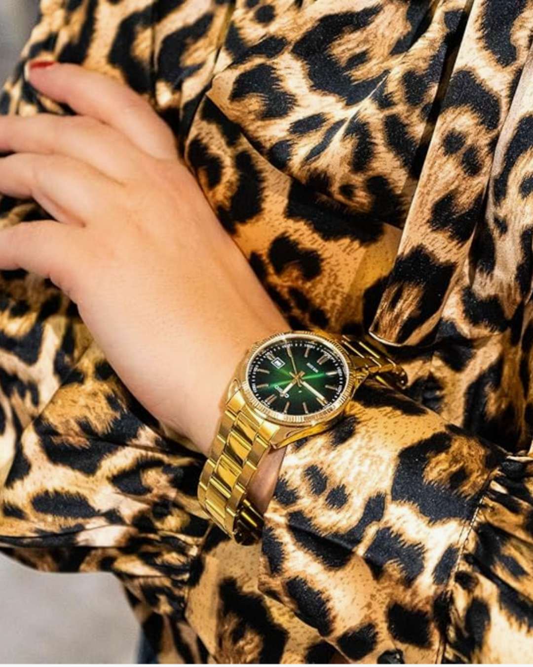 • Trendiges Design: Grün verlaufendes Sunray-Zifferblatt mit goldfarbenen Indizes und Zeigern.