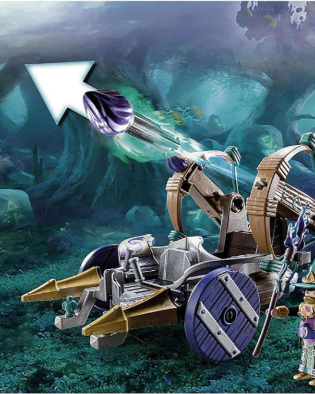 In Violet Vale treibt der dunkle Zauberer Umbrathor sein Unwesen. Doch die mutigen Magier Demonthella und Flamathor sind ihm bereits auf den Fersen. Ihr wendiger Fangwagen bietet Platz für zwei Figuren, die mittels Fußklemmen auch bei rasanten Fahrten sicher im Cockpit bleiben. Das Highlight des Gefährts sind die zwei funktionsfähigen Bolzenkanonen am Heck sowie der drehbare Düsenantrieb, der jede Verfolgung zum Erlebnis macht.