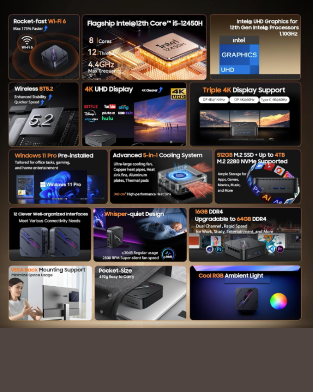 Trotz seiner enormen Leistung arbeitet der Blackview MP100 Pro Mini PC dank eines optimierten Kühlsystems extrem leise. Die moderne Konnektivität mit Wi-Fi 6 sorgt für stabile Drahtlosverbindungen, während Bluetooth 5.2 die nahtlose Anbindung von Peripheriegeräten ermöglicht. Das kompakte Design erlaubt eine unauffällige Platzierung auf dem Schreibtisch oder – dank VESA-Kit – direkt hinter dem Monitor.