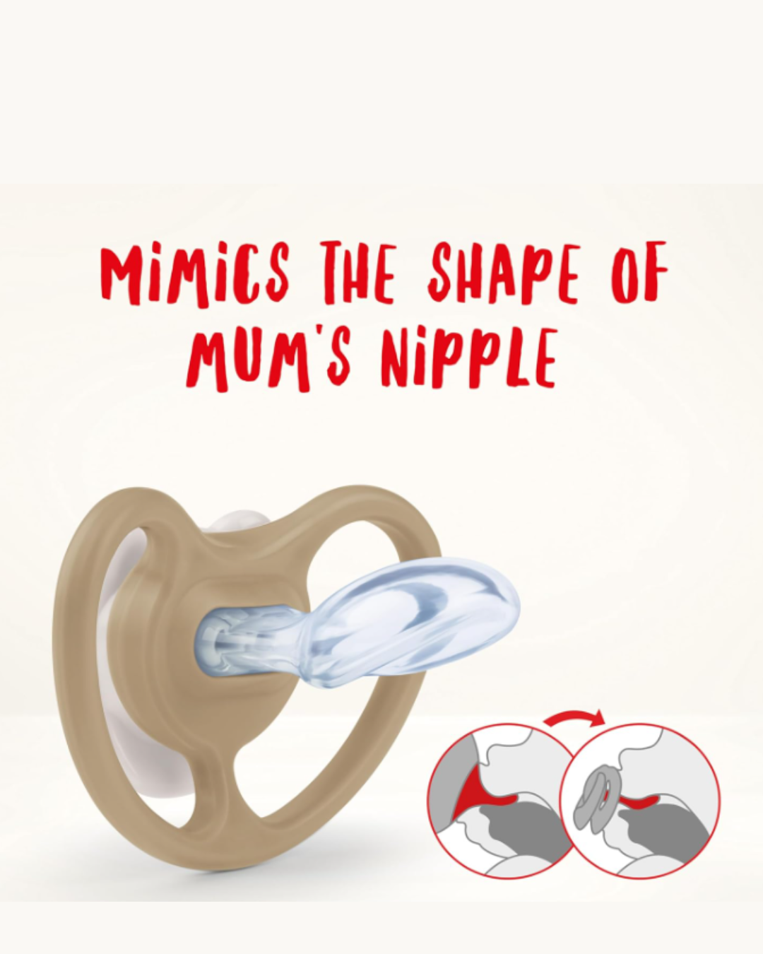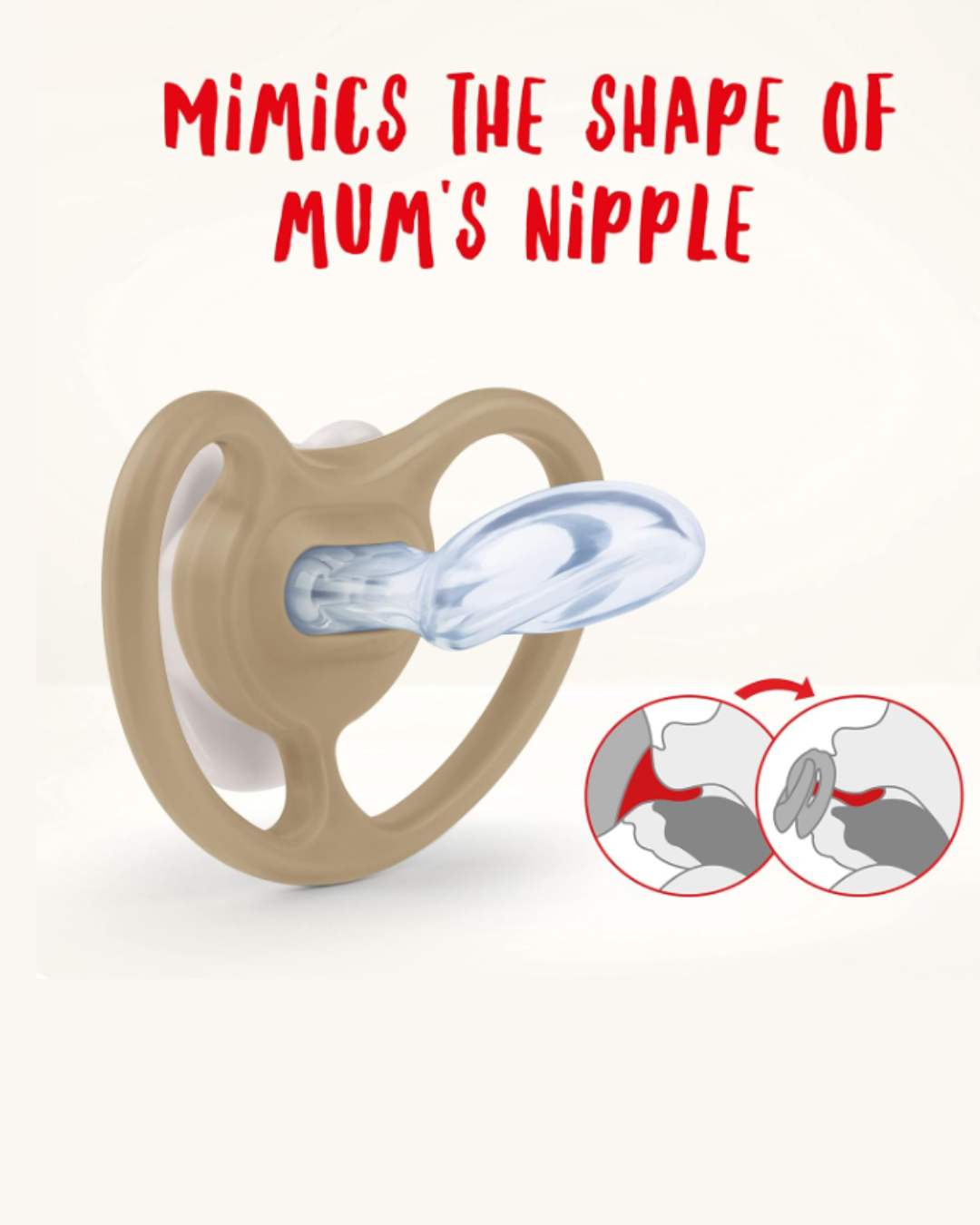 - NUK Originalform – angelehnt an die Brustwarze der Mutter beim Stillen für ein natürliches, beruhigendes Sauggefühl.